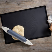 Die Oberfläche der Matte ist feinporig und somit antihaftend. Gerade bei der Arbeit mit klebrigem Teig kommt dir das zu Gute. Gibst du jetzt Unmengen an weiterem Mehl hinzu, läufst du Gefahr, dass der Teig zu trocken und fest wird. So kannst du erst einmal weiterkneten und Mehl und Wasser richtig miteinander vermengen ohne dass der Teig an der Arbeitsfläche anhaftet. Im Anschluss lässt sich der Teig auf die gewünschte Größe ausrollen oder formen und wieder einfach von der Unterlage lösen. Ebenso ist die Reinigung unter fließendem Wasser oder in der Spülmaschine unproblematisch.
