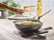 Dieser Wok hat einen etwas größeren Boden damit er auch auf normale Glaskeramik oder Induktions-Kochfelder passt.