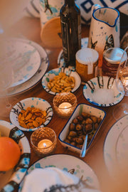 Wunderschöne handgearbeitete Keramik schmücken den Esstisch. Die Keramik ist backofen-, spülmaschinen- und mikrowellenfest.