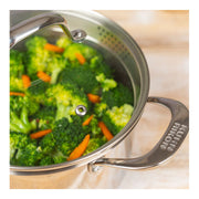 Der Kochtopf ist beidseitig mit einem Ausguss versehen, wodurch die Abgiessfunktion sowohl von Rechts- als auch von Linkshändern bequem genutzt werden kann. Der Glasdeckel verfügt über seitliche Öffnungen: Mit dieser cleveren Funktion lässt sich das Gargut stressfrei abgiessen und es ist kein zusätzliches Abgiesssieb notwendig: Die kleineren Löcher sind ideal zum Abgiessen von Reis, die grossen für Pasta und Kartoffeln.