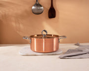 Der Olav Kupfertopf ist perfekt für alle, die ihre Saucen und Suppen gerne besonders präzise zubereiten und dabei die Kontrolle behalten möchten. Da das Kupfer bis hoch in die Wände gezogen ist, entsteht ein einzigartiger Wärmekreislauf, der deine Gerichte gleichmäßig gart. Bei spontanen Temperaturveränderungen reagiert Kupfer sofort und setzt die Wärmezufuhr präzise um.
