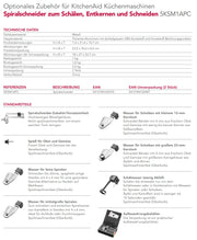 Zubehör zum Schälen, Entkernen und Schneiden mit vielseitigem Klingensystem (4-in-1-Funktionalität). Neun Kombinationen zum Spiralisieren, Schneiden, Schälen und Entkernen