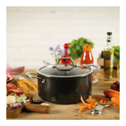 Dank des geschmiedeten Aluminiums überzeugt der Kochtopf mit einem hervorragenden Kochergebnis und einer optimalen Wärmeverteilung. Die dreilagige Antihaftbeschichtung verstärkt mit Titanpartikeln überzeugt durch ihre Langlebigkeit und ist ideal für fettreduziertes Kochen. Die Griffe bleiben auch bei hohen Temperaturen kühl und machen daher die Handhabung sehr angenehm. Damit der Koch auch immer weiss, was im Topf passiert, ist der Kochtopf mit einem Glasdeckel ausgestattet, welcher ein Beobachten des Gargutes ermöglicht ohne den Deckel anzuheben. Die einfache Reinigung spart Zeit und Wasser und ist ein weiterer angenehmer Pluspunkt dieses funktionellen Kochtopfes.