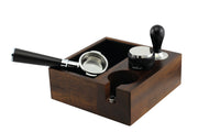 Lieferumfang: Abschlagbox aus Edelstahl und Wallnussgehäuse mit integrierter Tamperstation (Tamper, Leveler oder Siebträger nicht enthalten