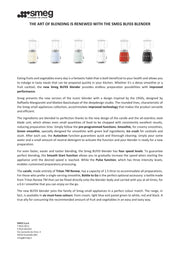 Der Smeg BLF03 Standmixer zerkleinert dank der voreingestellten Programme Zutaten unterschiedlicher Beschaffenheit für eine Vielzahl von Zubereitungen perfekt: Smoothie für cremigen Fruchtsaft, einen Joghurt, Green Smoothie mit grünem Blattgemüse, Ice Crush für das Zerkleinern von Eis oder die Zubereitung von erfrischenden Cocktails und Eisgetränken.