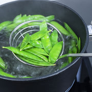 Der Seihlöffel sorgt mit seiner Länge von 39 cm dafür, dass deine Hand aus der Reichweite der heißen Spritzer ist. Er eignet sich aber nicht nur zum Herausheben von frittierten Speisen. Auch Taschen aus Nudelteig, wie schwäbische Maultaschen, Gnocchi, Tortellini oder Pelmeni, oder Knödel kannst du wunderbar aus dem heißen Wasser schöpfen. Ebenso ist der Sieblöffel zum Blanchieren von Gemüse geeignet. Und bildet sich beim Kochen von eiweißhaltigen Nahrungsmitteln Abschaum, kannst du ihn als Schaumlöffel nutzen.