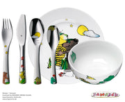 Lieferumfang: 1x Kindergabel, 1x Kindermesser, 1x Kinderlöffel, 1x Kinderkaffeelöffel, 1x Kinderteller, 1x Müslischale