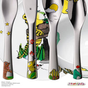 Das WMF Kinderbesteck Janosch besteht aus poliertem Cromargan®: Edelstahl Rostfrei 18/10 und ist für Kinder ab drei Jahren geeignet. Es ist mit den Hauptfiguren Tiger und Bär der Tigerente und Günter Kastenfrosch bedruckt. Die Besonderheit: An den Laffen der beiden Kinderlöffel finden sich ebenfalls kleine Abbildungen. Ein Kinderteller und eine Müslischale aus Porzellan vervollständigen dieses WMF Kinder-Set. Alle Teile sind farb- und formstabil und werden in der Spülmaschine kinderleicht wieder sauber.