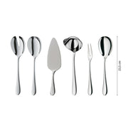 Lieferumfang: 12x Menuegabel, 12x Menuemesser, 12x Menuelöffel, 12x Kaffeelöffel, 12x Kuchengabel, 1x Salatbesteck (2teilig), 1x Serviergabel, 1x Servierlöffel, 1x Schöpflöffel, 1x Tortenheber