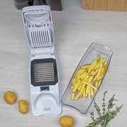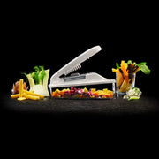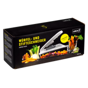 Der Lurch Würfel- und Stifteschneider in elegantem Iron Grey/Weiß verwandelt Gemüse und Obst im Handumdrehen in gleichmäßige Würfel oder Stifte. Ideal für Salate, Suppen, Beilagen oder dekorative Garnituren – präzise, schnell und mühelos.