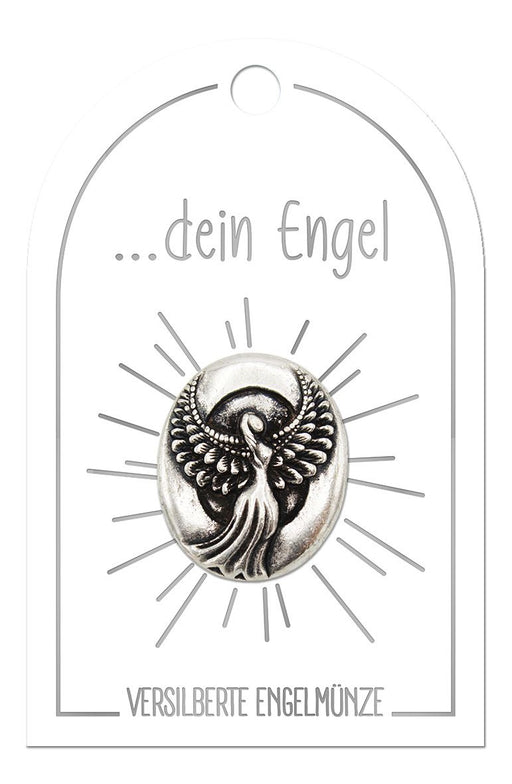 Eine besondere Engelsmünze auf einer liebevoll gestalteten Karte mit inspirierenden Botschaften wie "Ich bin bei dir", "Engel der Freude", "Du bist...